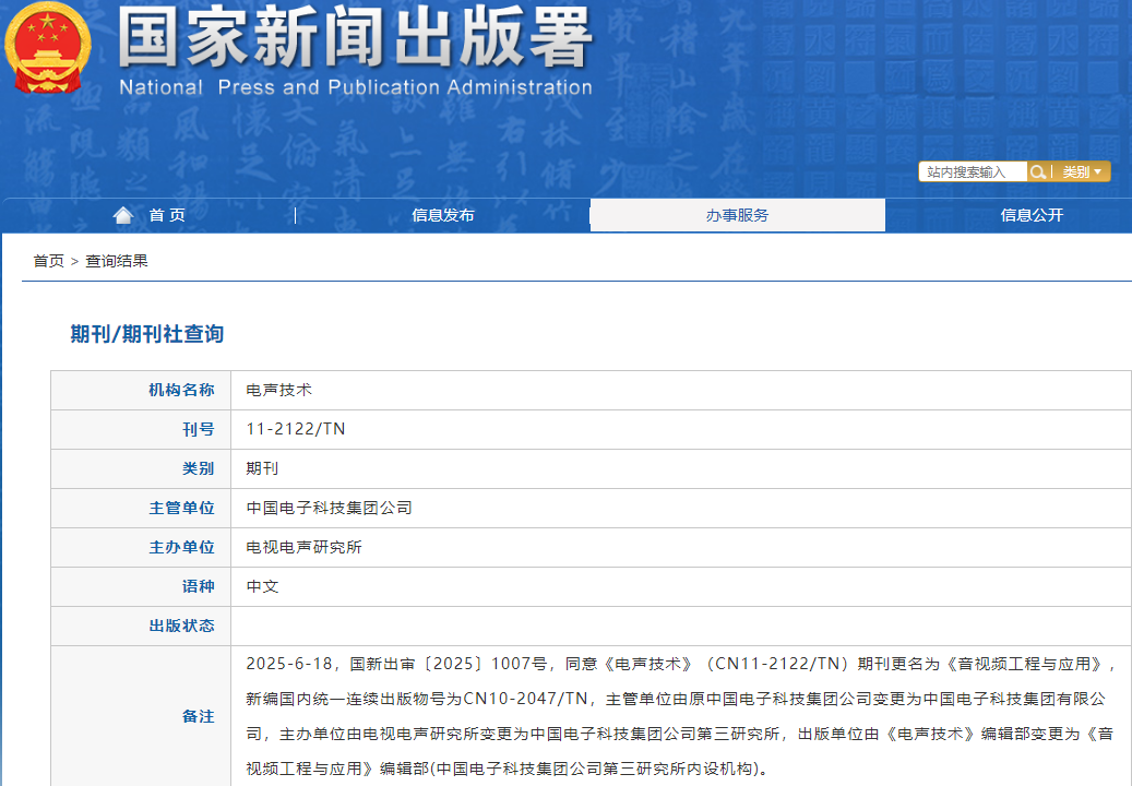 主办单位:电视电声研究所(中国电子科技集团公司第三研究所)