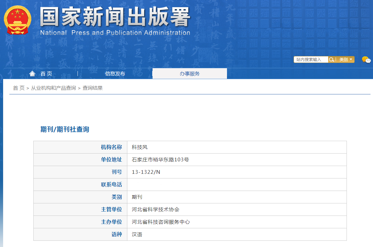河北科技风杂志社是1988年3月经国家新闻出版总署批准,河北省科学技术协会主管、河北省科技咨询服务中心主办的国内公开发行的大型综合类科技期刊。国内统一刊号:CN13-1322/N:国际标准刊号:ISSN1671-7341,旬刊标准大16K开本,经过几十年发展,主要业务范围涵盖期刊出版、网络传播、出版服务等多个领域,聚合了大批相关领域的专家学者及一线专业工作人员,特别是在教育科技、科学学科和科技领域有着广泛影响。