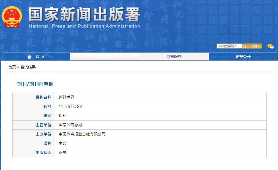《越野世界》是经国家新闻出版署批准,国家体育总局主管,中国体育报业总社有限公司主办的国家级刊物。国际标准连续出版物号:ISSN 1674-0378,国内统一连续出版物号:CN11-5616/G8,刊载国内外体育科技和汽车运动的新技术、新成果、报道汽车行业信息,介绍体育创新教育教学、体育运动项目新的训练方法、动态、和趋势,从而推动体育运动的发展。