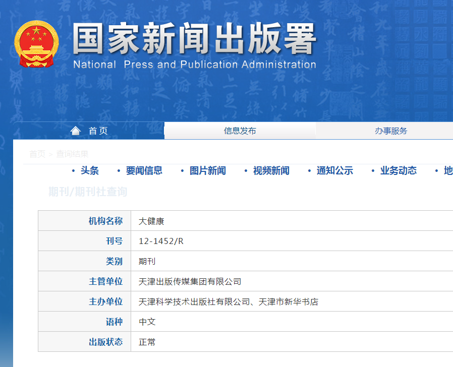 《大健康》杂志是经国家广播电视总局批准,国际刊号:2096-3556,国内刊号:12-1452/R。由天津出版传媒集团有限公司主管,天津科学技术出版社有限公司、《大健康》天津市新华书店主办的医学健康科技类专业学术理论期刊、《大健康》中国健康产业发展研究会会刊。