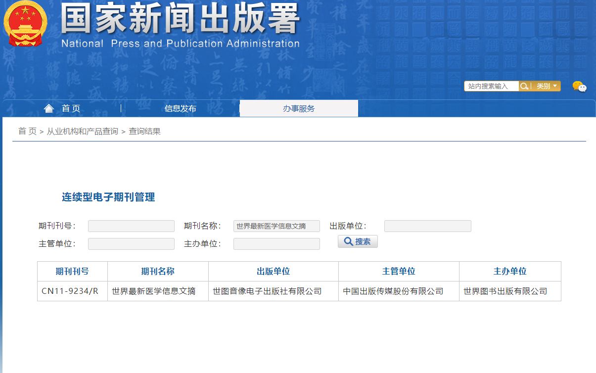 《世界最新医学信息文摘》杂志由国家新闻出版总署批准连续性电子期刊,中国出版集团公司主管,世界图书出版公司主办、中国医师协会系列国家级期刊。