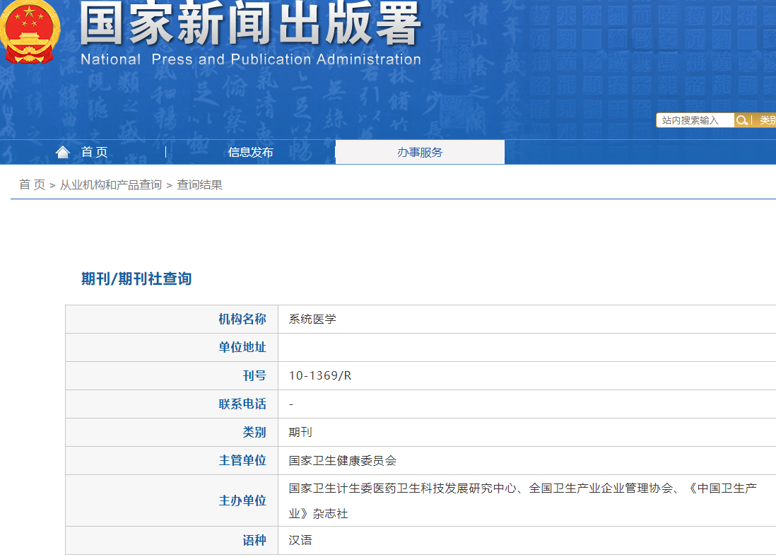《系统医学》杂志:是由国家卫生计生委医药卫生科技发展研究中心、全国卫生产业企业管理协会主办、国内外公开发行的综合性医学学术期刊。《系统医学》杂志主要报道医学各学科科学研究成果和临床实践,《系统医学》杂志并介绍国内、外医学科研动态和新进展。读者对象主要为各科临床医师、医学科研人员和医学生。