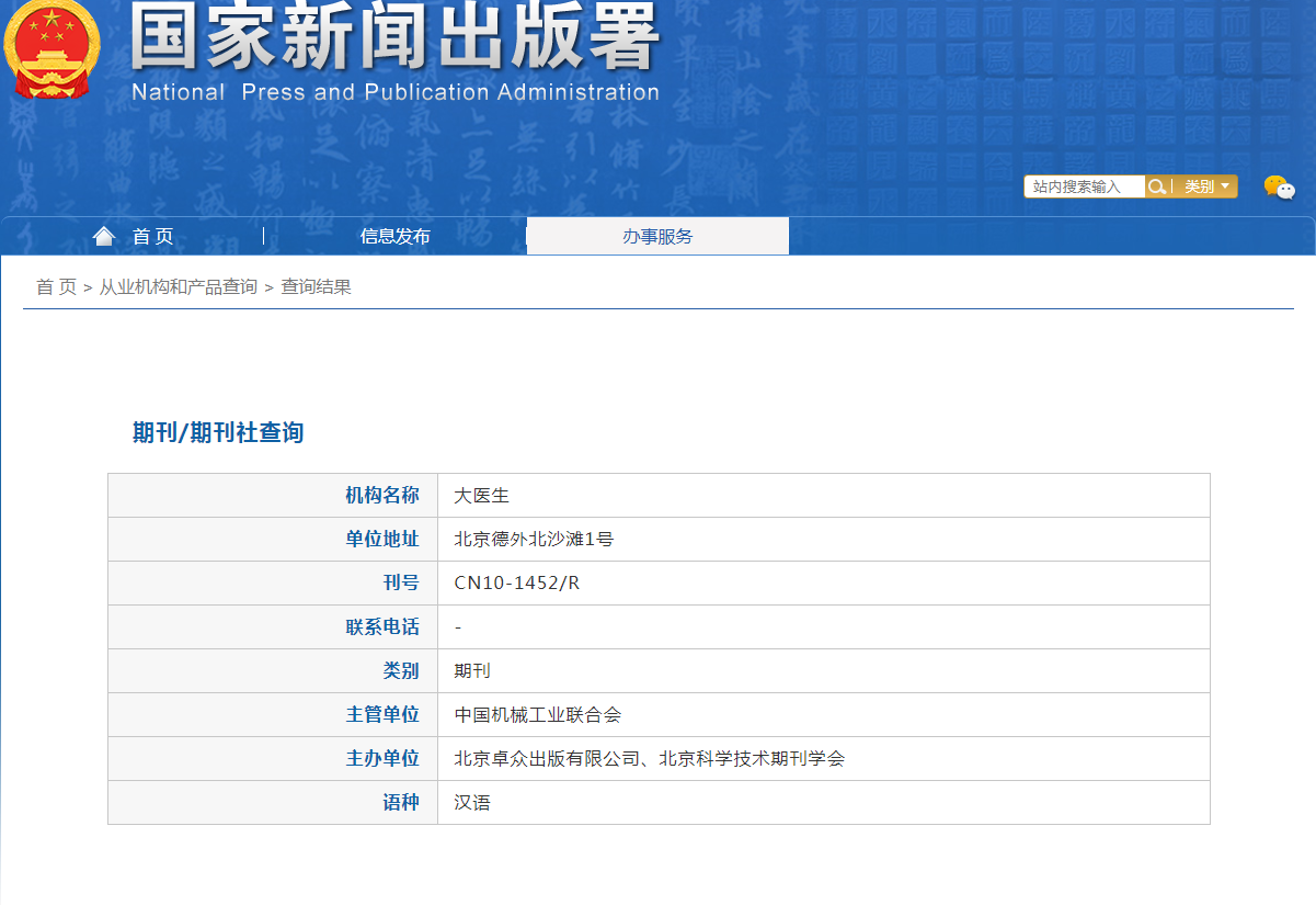 《大医生》杂志是国家新闻出版总署正式批准的国家级医学专业性综合学术期刊,《大医生》由中国机械工业联合会主管,北京卓众出版有限公司主办认可度非常高的学术性期刊。《大医生》创建于2016年,得到广大投稿者的好评,视为认可度高的期刊。