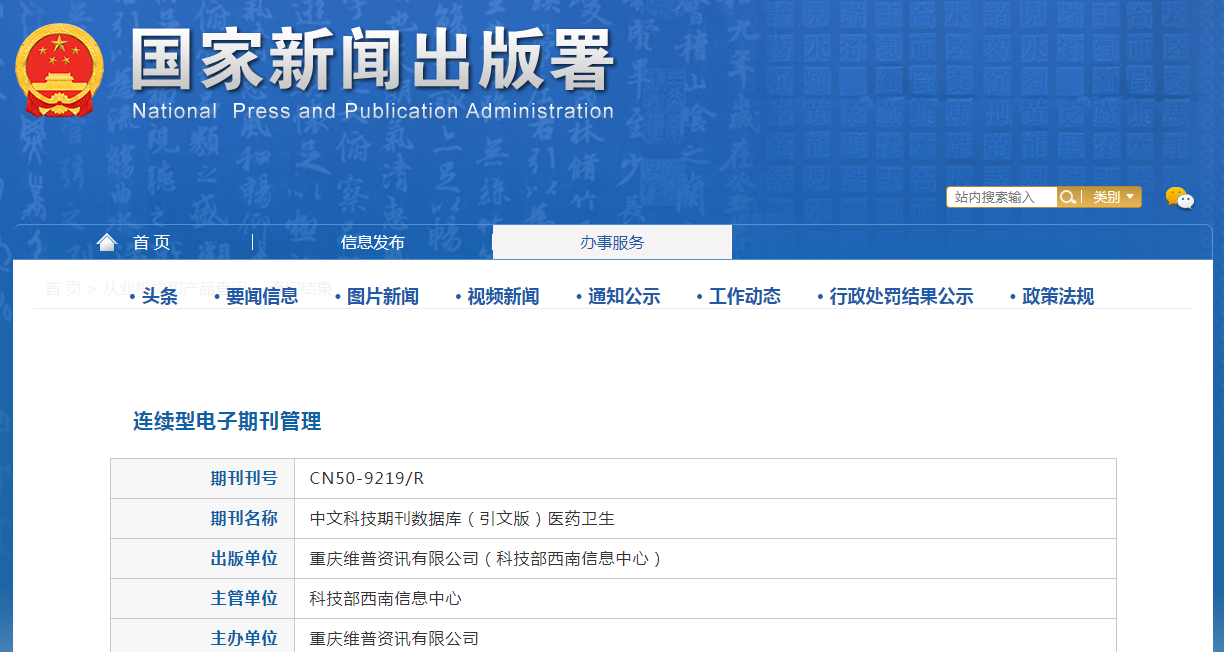 《中文科技期刊数据库(引文版)医药卫生》杂志是经原国家新闻出版广电总局批准,由科技部西南信息中心主管、重庆维普资讯有限公司主办的连续型电子期刊。国内刊号CN 50-9219/R,国际刊号ISSN 1671-5675。